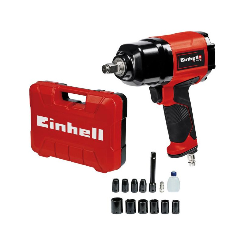Cheia pneumatică cu impact Einhell TC-PW 610 oferă multă putere pentru lucrările din casă, atelier și garaj. De asemenea, este ideal pentru sarcini dificile datorită puterii sale mari. Pistolul de impact robust are un cuplu maxim de 610 Nm, iar mânerul antiderapant, cauciucat, asigură că este sigur și confortabil să lucrezi în orice situație. Dispunând de funcționare în sens invers a acelor de ceasornic (într-o treaptă) și în sensul acelor de ceasornic (în trei trepte), cheia pneumatică cu impact poate fi utilizată pentru o întreagă gamă de sarcini de bricolaj. Performanța de top este oferită folosind un furtun cu un diametru interior de 9 milimetri sau mai mult. Presiunea maximă de lucru este de 6,3 bar, dimensiunea maximă a filetului de 19 milimetri. Produsul vine complet cu 10 prize de găurit în dimensiunile 8/10/11/13/17/19/21/22/24/27 milimetri și 1 sticlă mică de ulei și 1 niplu. Este inclusă și o extensie de 125 mm.