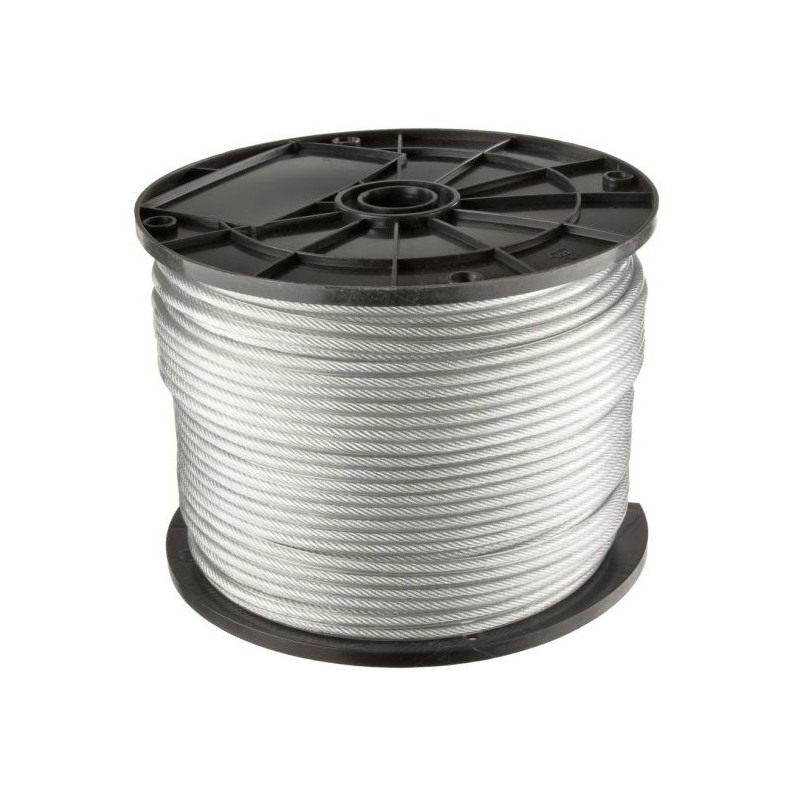 Cablu comercial din oțel zincat cu înveliș de PVC, cu diametrul Ø3 și disponibil într-o rolă de 100 de metri.
